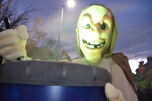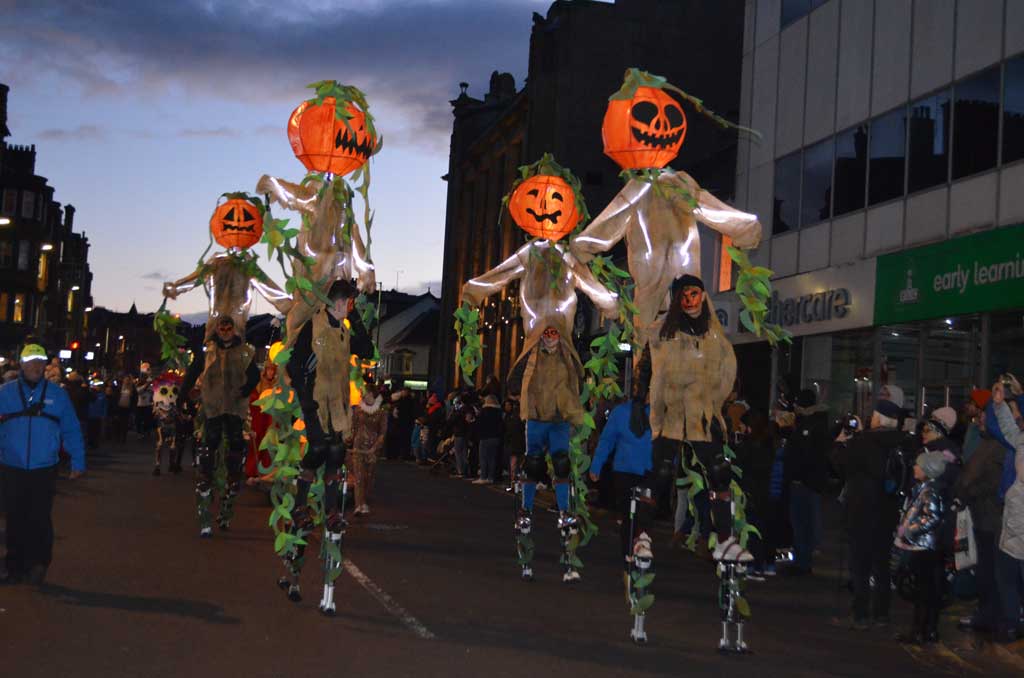 One of the sub-themes we set for the recent Halloween Festival was “The Renfrewshire Witches” which is a story relating to witch trials in Renfrewshire in the 16th century. Many of the costumed participants created costumes and props relating to the witch theme and we (as well as facilitating the costume-making) created a giant prop as focus for the theme. Below is a film of the witch on it’s first test run before being finally completed for the event itself. This relationship between large prop and group as well as tying into local history is a feature of our work.