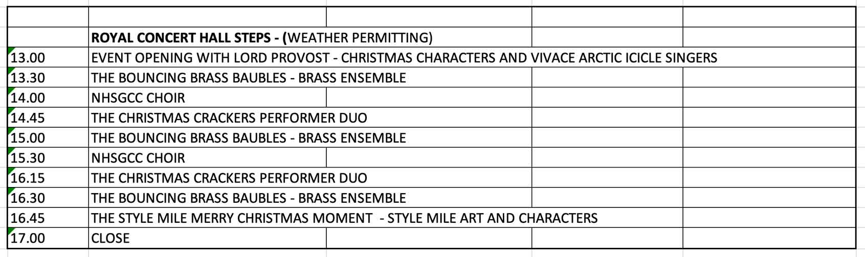 There will be live performances on the Royal Concert Hall steps from 13.00. See the schedule below